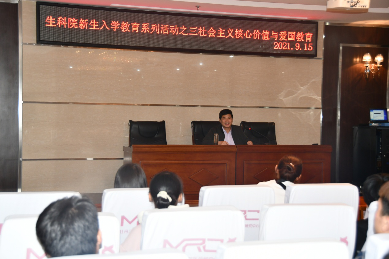 9月15日晚医药研究中心6楼会议室2021级全体新生激情四扬,正襟危坐,聚精会神聆听由生命科学学院院长初彦辉博士主讲的《社会主义核心价值观和爱国爱校教育》新生入学教育系列活动。