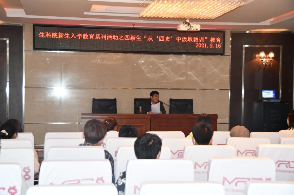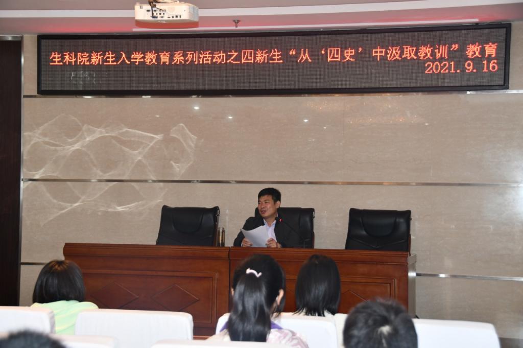 9月16日晚生命科学学院在六楼会议室,举办2021级新生入学教育系列活动之四,院长初彦辉教授应邀为全体新生作从四史”中汲取智慧和力量专题讲座,讲座由院学工办付小达老师主持,初教授从历史逻辑出发,以党的重要会议为线索,具体阐述了学习“四史”的目的与内容,深刻揭示了“四史”的核心与灵魂,并对“四史”的经验教训做了总结。初教授强调,读史让人更有气质更有智慧,更有厚重感,更有力量。
