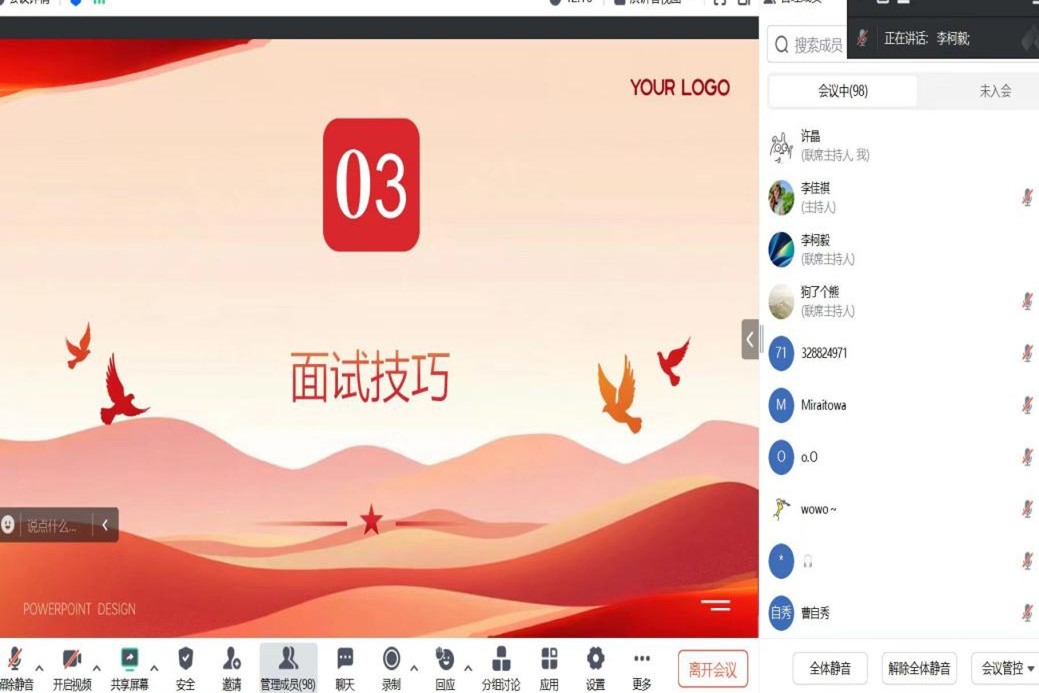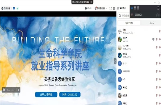 为进一步发挥就业指导工作中朋辈引领的带动作用,帮助我院有意愿参加公务员招考的同学明晰公务员考试备考方向和重点,生命科学学院于3月13日在腾讯会议召开公务员备考经验分享会。本次分享会邀请我院目前就职于共青团呼中区委员会组织宣传部的2019届生物医学工程专业毕业生李柯毅同学主讲,会议由辅导员许晶主持。会议吸引了我院众多对公务员考试感兴趣的同学参与,大家积极互动交流,收获满满。