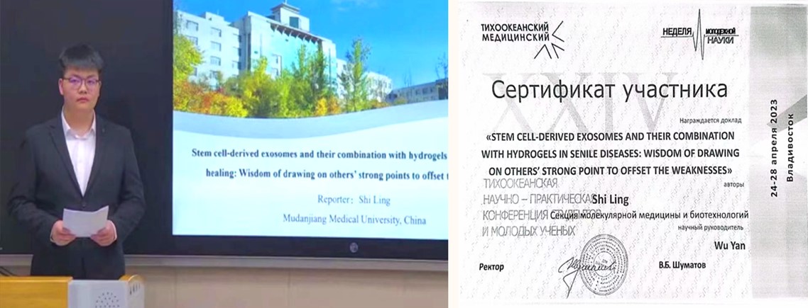 在今年四月,他代表学校参加了由俄罗斯太平洋国立医科大学举办的第二十四届太平洋科学实践会议,并在会上作了关于生物材料修复糖尿病创面的报告,与各国友人分享中国智慧,进行学术上的交流,展现了牡医学子之风采,担当了中国青年之责任。
