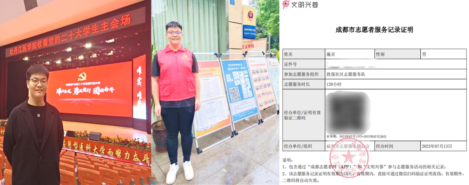 施灵同学在开学之初递交了入党申请书,次年被党组织列为入党积极分子。在平时的学习生活中,他也努力将入党积极分子的一片赤诚化作实际行动的滴滴汗水。在班级中担任学习委员,院学生会中担任学习部副部长期间,尽己所能协助老师和同学处理学业、工作、生活中遇到的一些问题,并组织开展了系列学习、课外文娱等活动,丰富同学们的大学生活。为践行习近平总书记对青年的号召:“立志做有理想、敢担当、能吃苦、肯奋斗的新时代好青年,让青春在全面建设社会主义现代化国家的火热实践中绽放绚丽之花”和社会主义核心价值观,他利用2023年暑假休息时间到所在社区担任志愿者,服务时长达120个小时。通过宣传国家政策法规和热情周到的服务,加强了居民对社区规章制度的了解和遵守法律法规意识,以及促动了社区居民对社会服务的积极性,促进了社区和谐发展。
