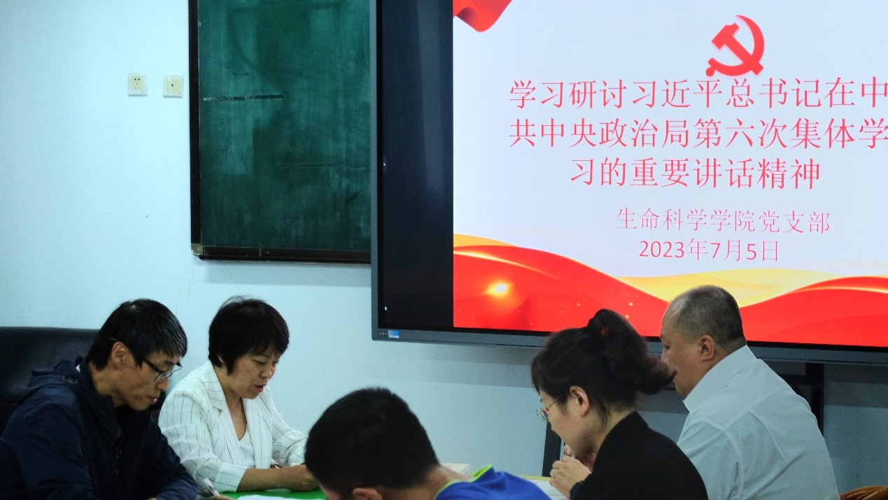 为扎实深入开展习近平新时代中国特色社会主义思想主题教育工作, 落实“第一议题”制度,生命科学学院党支部于2023年7月5日下午15点,在生命科学学院学生活动室组织全体党员以“第一议题”的形式,专题学习研讨习近平总书记在中共中央政治局第六次集体学习时的重要讲话精神,同时学习了黑龙江省深化能力作风建设工作会议精神。会议由党支部书记袁晓环同志主持。