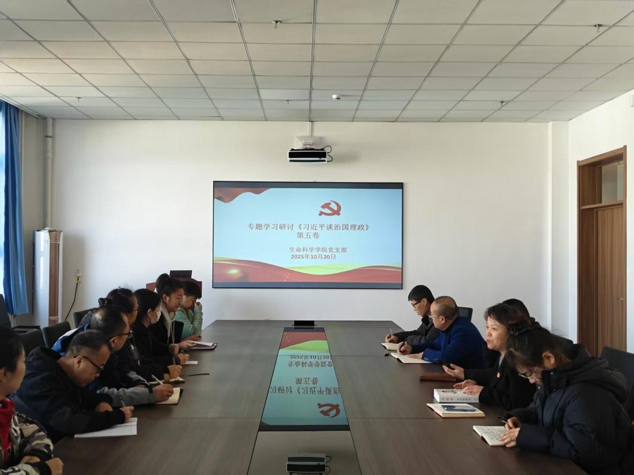 为巩固拓展学习贯彻习近平新时代中国特色社会主义思想主题教育成果,2025年10月20上午9时,在生命科学学院9楼会议室,生命科学学院党支部组织全体党员专题学习研讨《习近平谈治国理政》第五卷。