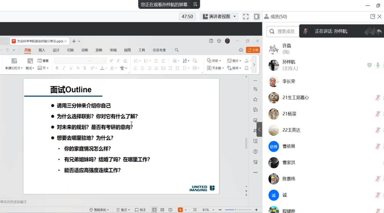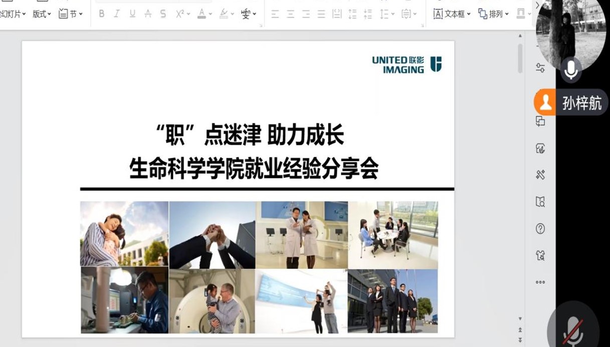 为助力我院2024届毕业生进一步明晰就业目标,积累就业经验,发挥就业“朋辈引领”作用,11月16日19:00,我院在线上召开“职”点迷津,助力成长——生命科学学院就业经验分享会。本次分享会邀请到2019级生物医学工程毕业生,目前就职于上海联影医疗科技股份有限公司的孙梓航同学进行经验分享。学院副院长李长荣、2020级和2021级生工专业同学参加会议,会议由辅导员许晶主持。