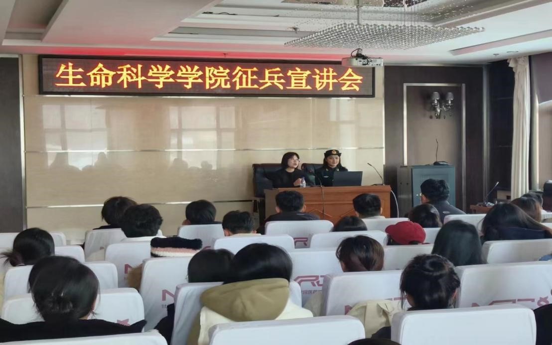 为进一步做好国家征兵入伍相关政策的宣讲力度,扩大征兵宣传影响力和辐射面,激发学生参军入伍热情,把爱国之心化为报国之行。生命科学学院于11月23日在医药研究中心六楼会议室召开征兵宣讲会。会议邀请我校军事爱好者协会退役大学生事务部部长刘雅楠同学进行宣讲,我院全体学生参加,会议由辅导员许晶主持。