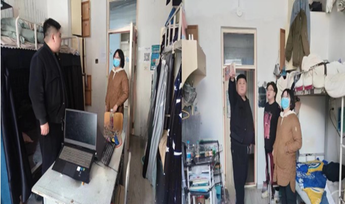 走访调研中,付小达和许晶老师围绕返校情况、学习、生活状态等问题与同学们进行了亲切交流,对学生私自外宿情况;违规使用大功率电器设备情况;保存和使用酒精炉等明火燃烧器具情况;私拉乱接电线及使用劣质电源插座等其它非安全器具情况;宿舍保存管制刀具等非法器具的情况;宿舍其他安全隐患情况进行了严格细致的检查。纠正了个别学生宿舍卫生较差、私拉电线、插板上长期不拔的电器等安全隐患行为,询问、关心同学们关于宿舍环境、网络使用等生活与学习情况,并对学生寝室存在问题和同学们提出的意见建议逐一登记。同时要求宿舍成员要友爱互助,重视安全、卫生,树立优良寝风。要多去运动场上强身健体,增强身体抵抗力;多去图书馆、自习室学习钻研,提升自身专业学习素养。