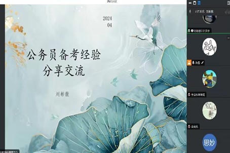分享会上,刘彬傲从公务员考试概要、岗位选择、备考方法和互动答疑四个方面展开分享交流。从自身备考经验出发,详细阐述了公务员考试的题型、如何制定学习计划和笔试面试中的答题技巧。最后,刘彬傲与参会学生进行了互动交流,详细解答了同学们的提问,建议大家要选择适合自己的发展方向,早准备、早规划。