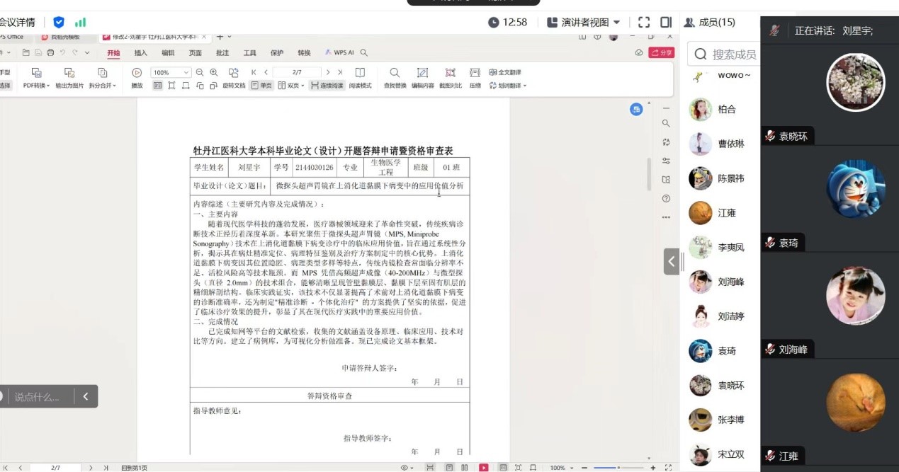 答辩环节中,两组指导教师对学生的开题内容进行全面审核与指导。学生通过共享《牡丹江医科大学本科毕业论文(设计)开题答辩申请暨资格审查表》及《课题开题报告书》,围绕选题背景、研究目标、实验设计及当前进展等内容进行汇报。随后,指导教师针对研究方案的可行性、技术路线合理性、文献综述深度及学术规范性逐一点评,并提出具体修改建议,帮助学生明确后续研究方向。