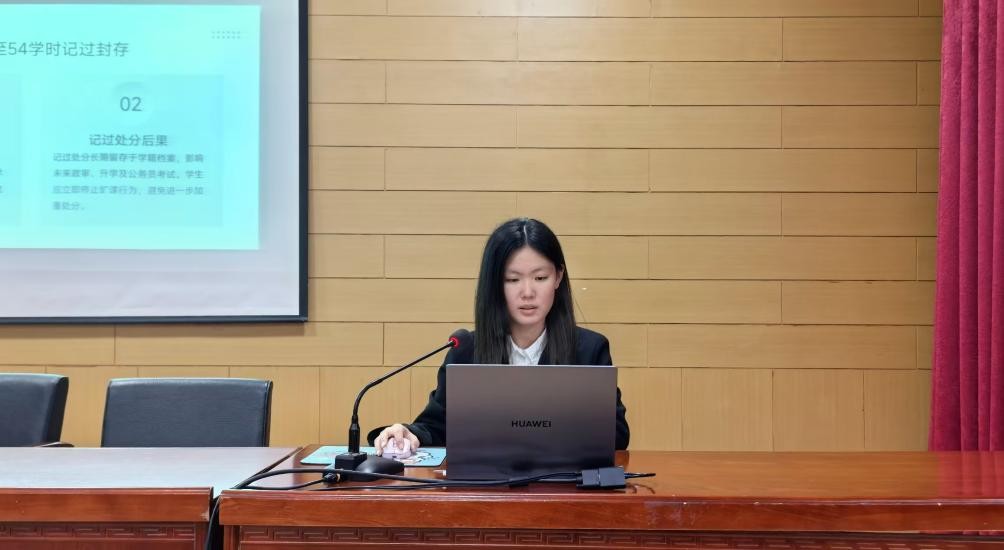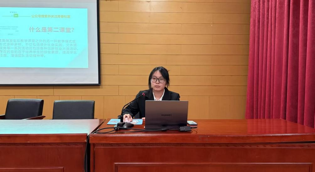 刘婷婷同学对“第二课堂”进行深入解读。她阐述了第二课堂在大学生综合素质培养中的重要意义,讲解了第二课堂学分认定标准、活动参与方式及学分获取途径。她表示,第二课堂是第一课堂的延伸和补充,希望新生们积极参与各类校园文化活动、社会实践和志愿服务,全面发展,丰富大学生活体验。