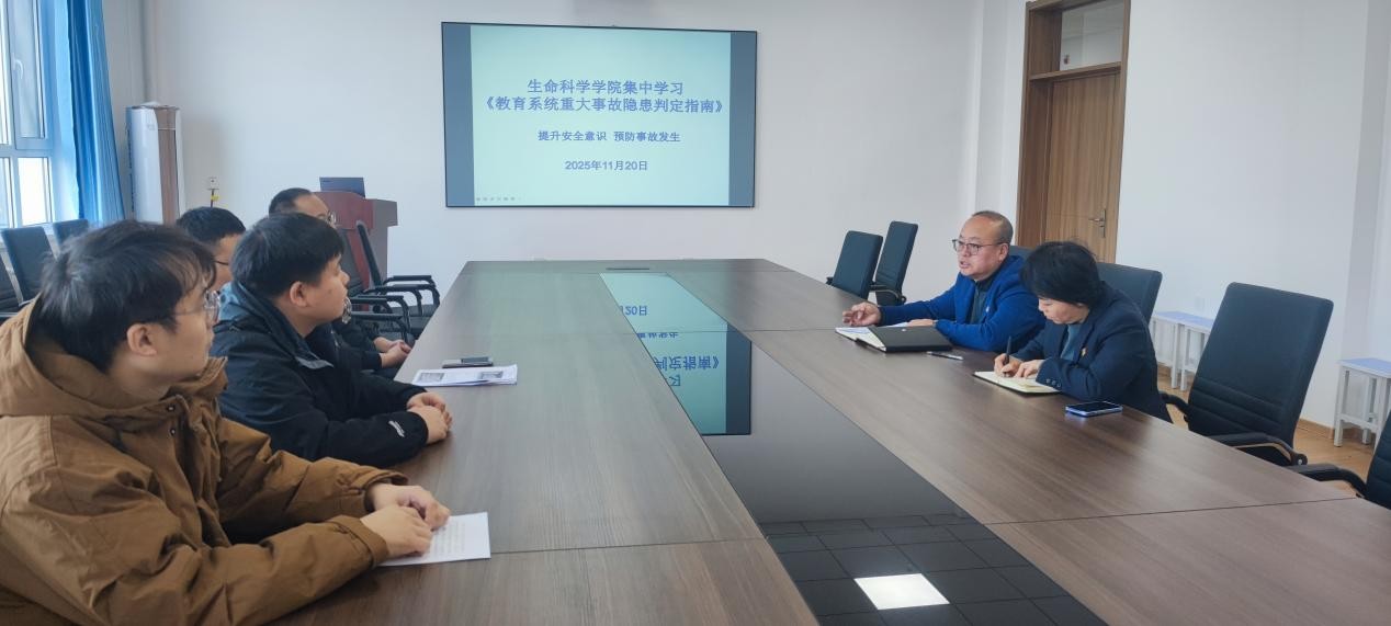 为深入贯彻落实教育部关于教育系统安全工作的部署要求,有效防范和遏制重大事故发生。11 月 20 日,生命科学学院在九楼会议室组织召开《教育系统重大事故隐患判定指南》专题学习会议。院长袁晓环、实验教学中心相关教师参加学习。