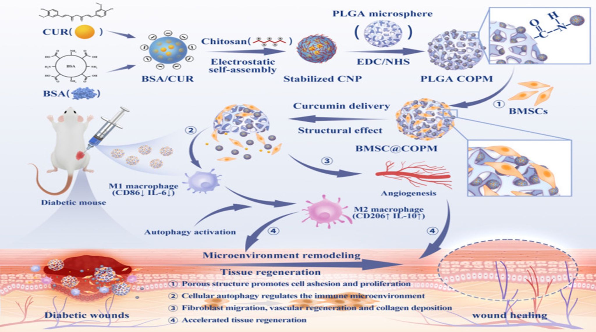 该研究创新性地构建了负载姜黄素@BSA纳米颗粒和骨髓间充质干细胞的开放多孔微环境调控微球用于糖尿病创面治疗,深入探究了姜黄素的生物活性特性,及其在改善糖尿病伤口微环境、促进创面愈合中的作用机制,为糖尿病慢性创面的临床治疗提供了全新的生物材料策略和理论依据。