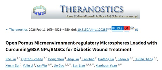 近日,牡丹江医科大学生命科学学院袁晓环院长、武艳副院长牵头,联合华东理工大学李玉林教授课题组、海军军医大学第一附属医院(上海长海医院)临床研究中心高洁研究员团队,在国际知名期刊《Theranostics》发表题为《Open Porous Microenvironment-regulatory Microspheres Loaded with Curcumin@BSA NPs/BMSCs for Diabetic Wound Treatment》的高水平研究论文,聚焦姜黄素特性及其在糖尿病伤口治疗中的应用,为相关领域研究提供了重要参考。