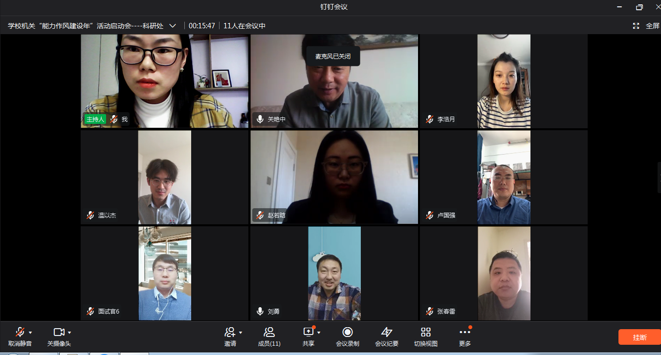 4月18日下午,科研处通过钉钉线上视频会议的方式召开了机关“能力作风建设年”活动启动会,会议由科研处处长关艳中主持,科研处全体工作人员11人参加会议。